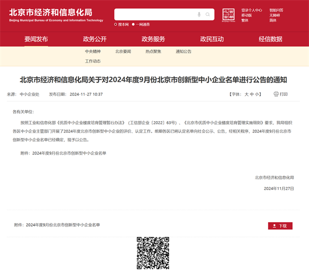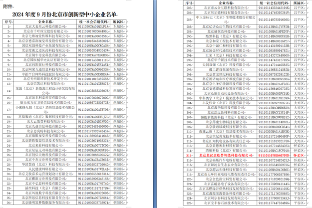 根据《北京市经济和信息化局关于对2024年度9月份北京市创新型中小企业名单进行公告的通知》(2024年11月27日),按照工业和信息化部《优质中小企业梯度培育管理暂行办法》(工信部企业〔2022〕63号)、《北京市优质中小企业梯度培育管理实施细则》要求,2024年度9月份北京市创新型中小企业名单已经确定,现予以公告。
